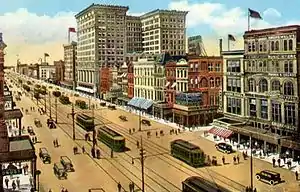 Both business and government leaders in New Orleans have taken steps over the past 50 years to encourage development and corporate centered business in the city. These began with the construction of the Superdome using public money, choosing not to build an expressway along the Mississippi River in the French Quarter and allowing the riverfront to be developed for tourism, and the under used wharves made available by the New Orleans public port authority for non-maritime use in the 1960s.[6] These decisions opened the door for changes in land use, encouraging business, especially that of the tourism industry, for the city. The downtown New Orleans segment of Canal Street has been undergoing redevelopment along the lines called for in the Downtown Development District's Canal Street Vision and Development Strategy (2004). In recent years the street has welcomed the addition of numerous new anchor enterprises, including the Ritz-Carlton New Orleans, luxury apartments at 1201 Canal, the New Orleans Bio-Innovation Center, the rehabilitated Joy Theater, the Saint Hotel, the Audubon Nature Institute's Audubon Insectarium, and the Astor Crowne Plaza. In October 2011, the New Orleans City Council granted final approval for the construction of 1031 Canal, a 190-foot (58 m) multi-use high-rise at the northeast intersection of Canal and North Rampart Streets.[7] The building, under construction as a Hard Rock Hotel, was the site of a partial building and crane collapse on October 12, 2019.