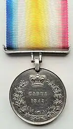 'CABUL 1842' within a laurel wreath, surmounted by a crown. For the advance on Kabul, culminating in the city's capture on 15 September 1842. Approximately 12,750 were awarded.