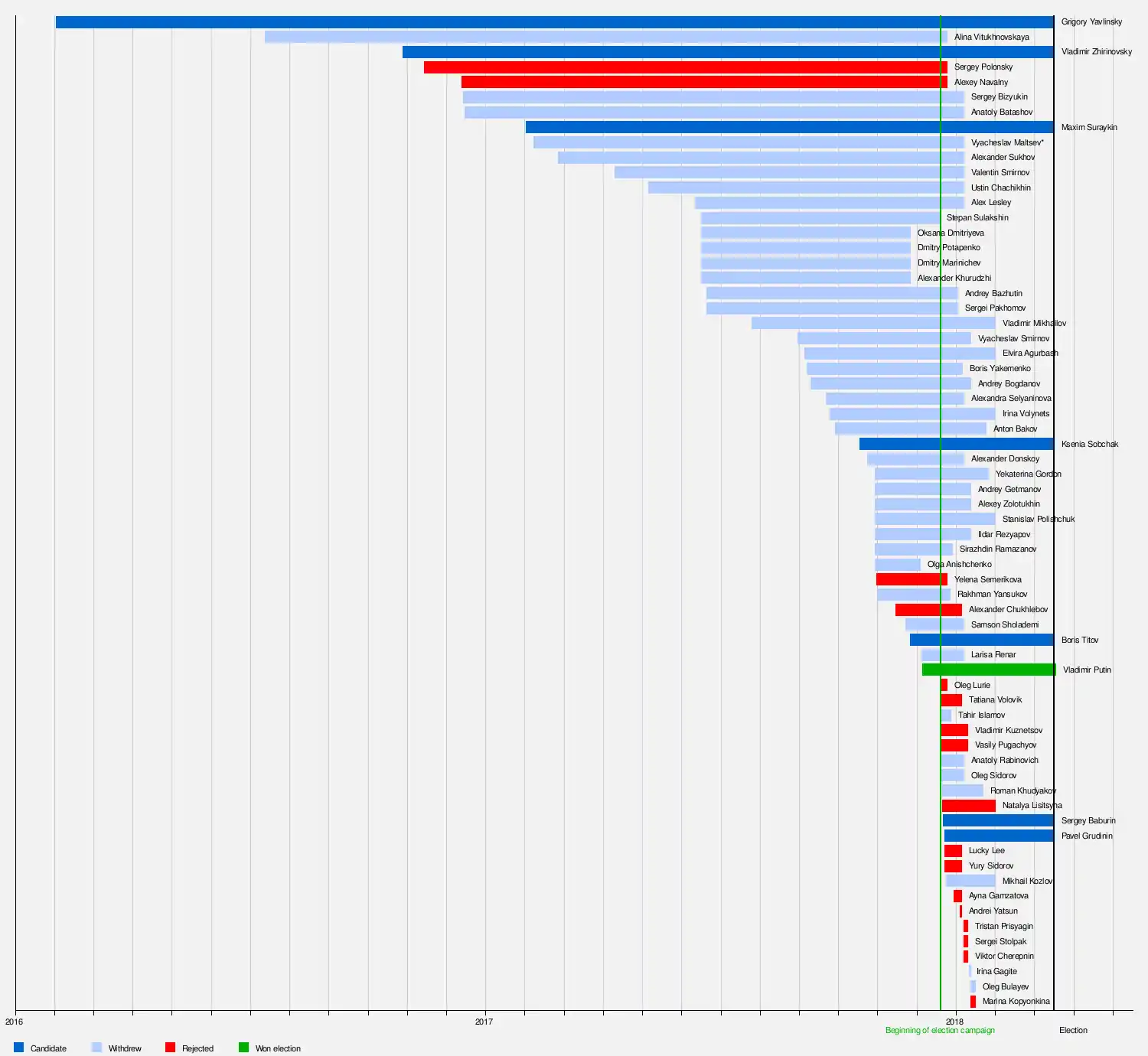 Independent | None | On 20 December 2017 the CEC announced that journalist Oleg Lurie had notified the Commission that he intends to participate in the election as a candidate.[77] Lurie was nominated by an initiative group on 24 December.[78] He filed registration documents with the CEC on the same day.[79] Lurie's bid was rejected by the CEC on 25 December because of a past criminal conviction.[80] In addition he only submitted one of the necessary documents.[81] | |