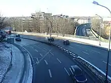 The four-lane part, comprising the Mittlere Ring, crosses the Candidplatz and the Auer Mühlbach as an elevated through road (called Candidhochstraße or Candidbrücke) and then connects with the Isar slope below the serpentine of the first branch. From there, the road runs in four lanes in the Candidtunnel to the eastern part of the Tegernseer Landstraße, which here is led in a ditch. The elevated road has noise barriers painted yellow-green on both sides. A photovoltaic system is installed on the southern wall.[2]