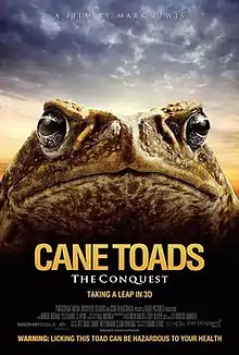 Cane Toads: The Conquest, a 2010 documentary film by Mark Lewis, tracks the inexorable decades long march of the invasive cane toad across Australia, a "sequel of sorts" to his 1988 cult classic, Cane Toads: An Unnatural History. It is described as an "irreverent" blend of "history, nature footage, re-enactments and colorful testimony," documenting what is widely considered to be one of Australia's biggest environmental disasters through its effect on people. It was filmed in 3D.[4][5][6][7]