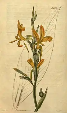 Canna pedunculata is a species of the Canna genus, belonging to the family Cannaceae. Native of south-east Brazil at low altitudes. Johnson's Dictionary of 1856 reports that it first entered England in 1820, pedunculata meaning 'long-flower-stalked'.