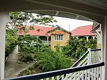 In 1954 the type was improved by replacing the proliferation of stumps in the understorey with a timber truss that spanned the width of the classroom and provided an unimpeded play space. This concept was further refined in 1957 by replacing the timber truss with a steel open-web joist that spanned further and removed more understorey stumps. This structural system was employed with reinforced concrete piers to support large loads at minimal cost.[42] This particular concept was applied in the 1959 construction of Block A, a two-storey brick and timber building (Type F/T7) stepped in section to link with Block B by a walkway. This structure was supported on concrete columns and steel open web joints with a cantilevered portion supporting the verandah. The understorey of Block A was left open for playing until the design was modified to add another classroom on the lower level.[18] The use of brick in the construction of Block A follows a structural scheme typical of 1950s school architecture.[43] It was partially constructed on land acquired in 1957 after the Department of Public Instruction purchased a property, to the west of the school on Wynnum Road, for future extensions to the school.[44][1]