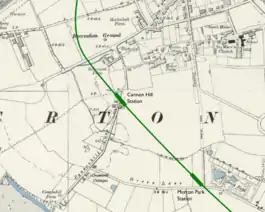 The station was to have been built on the W&SR's planned surface railway line in Surrey (now south-west London) from Wimbledon to Sutton.[1] The station was to be built on a bridge where the railway crosses Cannon Hill Lane.[2] The construction of the railway was approved in 1910.[3] In 1911 the UERL agreed to provide funding for the line's construction and to operate its train services by extending the UERL's District Railway (DR) from Wimbledon station.[4]