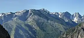 During the Pleistocene period dating back over two million years ago, glaciation advancing and retreating repeatedly scoured the landscape leaving deposits of rock debris.[5] The last glacial retreat in the Alpine Lakes area began about 14,000 years ago and was north of the Canada–US border by 10,000 years ago.[5] The U-shaped cross section of the river valleys is a result of that recent glaciation. Uplift and faulting in combination with glaciation have been the dominant processes which have created the tall peaks and deep valleys of the Alpine Lakes Wilderness area.