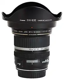The Canon EF-S 10–22mm f/3.5–4.5 USM lens is a wide to ultra-wide angle zoom lens for Canon digital single-lens reflex cameras with a Canon EF-S lens mount.[2] The field of view has a 35 mm equivalent focal length of 16–35mm, which is analogous to the EF 16–35mm f/2.8L on a full-frame camera. The 10–22mm is an internal focusing lens. Of the 13 elements, one is of Canon's Super Ultra-Low Dispersion glass and three are aspherical elements.
