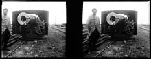 A number of Mle 1893/96 M guns were fitted to the same railroad carriage as the older model in 1917, although it only weighed 60 tonnes (59 long tons; 66 short tons). The gun could elevate between +3° and 40°, but retained the same minimum firing elevation of 10°. It could use the same ammunition as the older guns, but could also fire a new 49.8 kg (110 lb) high-explosive shell fitted with a ballistic cap at a velocity of 830 m/s (2,700 ft/s) to a range of 19,200 m (21,000 yd).[2] Eight of these railroad guns remained in French service after the end of World War I and at least four were captured by the Germans and given the designation 16 cm Kanone (E.) 453(f) although what use was made of them, if any, is unknown.[5]