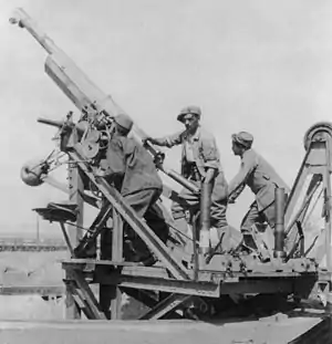 - 7.7 cm FlaK L/35 - a Krupp conversion of captured M1897 field guns to fire German 7.7 cm ammunition. The guns were placed on a modified de Bange 120 or 155 carriage to allow up to 60° of elevation and the guns were mounted on an elevated ring to allow 360° of traverse. By Spring of 1916 every division had a two gun platoon for AA defense and 394 guns were converted. An unknown number of guns were also converted by Rheinmetall to stationary AA guns. This conversion entailed mounting the guns on a high-angle pedestal mount with a platform and 360° traverse.[4] When the barrels became worn out they were replaced with German made ones of the same length without the distinctive muzzle roller guides of the French gun.[5]