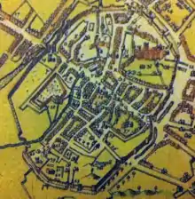 Wooden "bars" had been placed outside many of the city gates to regulate the flow of traffic by the 12th century, including Riding Gate, Worth Gate and North Gate.[38] One area of the city beyond the wall, called the baggeberi, may also have been protected by its own earthworks during the middle of the 12th century.[39] Canterbury was divided into wards by the 12th century, although these may potentially have been created as early as the Anglo-Saxon period.[40] These administrative districts, named after the city gates, were termed berthae and were linked to maintenance and manning of the city walls.[41] The wards took the form of segments, spreading out from the centre of the city, incorporating the relevant gate and sometimes the suburbs beyond that had spread outside the walls.[42] By the 1160s Canterbury's wards included Burgate, Northgate and Newingate, with the wards of Riding Gate, Worthgate and West Gate being formed by the end of the century.[42]
