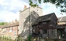 The inhabitants of Canterbury put up no resistance to the Normans during their conquest of England in 1066.[30] William the Conqueror instructed that a castle was to be built in the city; Canterbury Castle was built on the south side of the city and formed part of the circuit of defence, with property being destroyed to make room for it.[31] Despite its location along the walls, archaeologists Oliver Creighton and Robert Higham have observed that the castle was not an "addition" to the defences, but more an "imposition" on the town within it.[32] The first timber motte and bailey castle was later abandoned and a second, with a square, stone keep, built in 1123.[33] The Worth Gate became the south entrance to the castle site, and a new gate was put into the walls to the east for general use.[34]