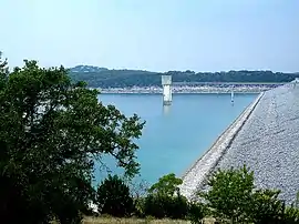 The dam is 6,830 feet (2,080 m) long, across a narrow section of the Guadalupe River valley. The top of the dam is 974 feet (297 m) above sea level, or 224 feet (68 m) above the riverbed. A spillway, located south of the dam, protects the dam by releasing water when the lake level rises to 943 feet (287 m) above sea level.