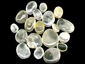 Cape May diamonds are actually pieces of quartz washed down, and worn smooth in the process, from the upper Delaware River.[1] Apocryphally, the trip takes thousands of years.[2][3] However, geologists suggest the pebbles are local in origin, washing out of nearby Pleistocene gravel deposits.[4][5] Cape May diamonds are sometimes incorrectly described as river-smoothed glass discarded by New Jersey's once-thriving glass manufacturing industry.