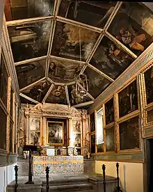It is decorated with ceiling paintings, gilded carved wood altars, and sculptures in the Manueline style. It has a gabled façade and the Gothic doorway is all that remains of the original chapel. Major changes were made in the 16th century when the altar was remodelled and window-slits added. Some of the aisle altar paintings date from this period and are attributed to the royal painter Fernao Gomes. The main altar paintings are probably from another paint workshop and have the dates 1615 and 1616 inscribed in the musician angels and the scenes of the Patron Saint's life.