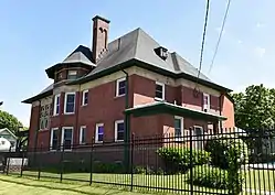 The Capt. Nicholas W. and Emma Johnson House is a historic building located in Des Moines, Iowa. The house is an unusual example in Des Moines of Châteauesque design elements added to a late Queen Anne style house.[2] The design was attributed to Des Moines architect Oliver O. Smith and was built by local contractor Charles Weitz. The 2½-story brick structure features large massing, a prominent front-facing gable, two full-height polygonal side bays, steeply pitched hipped roof, smooth and rough wall surfaces, contrasting courses, and the fleur-de-lis motif executed in stone, ceramic tile, and glass.