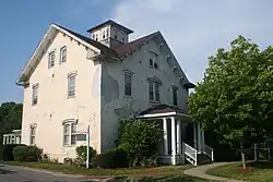 The Capt. Sylvester Baxter House is a historic house in Barnstable, Massachusetts. The 2+1⁄2-story wood frame Italianate house was built c. 1855 by Captain Sylvester Baxter, a politically prominent local ship's captain. The house exterior has been stuccoed, and the roof is a cross-gable style with a square cupola on top. The eaves of the roof and cupola are studded with decorative brackets. The windows are topped by stilted segmented arches. The front entrance is sheltered by a hip-roofed porch supported by clusters of round columns.[2]