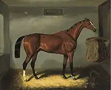 Caractacus was foaled in 1859 at William Blenkiron's Middle Park stud farm in Eltham. He was sired by Kingston (foaled 1849), described as "one of the handsomest horses"[2] and a winner of several important stakes races. Kingston died in 1861 before Caractacus’ Derby win. Caractacus' dam, Defenceless (foaled in 1844), was bred by W. Etwall and was sired by Defence out of an unnamed mare sired by Cain. Defenceless was not a successful racehorse, starting only once as a two-year-old and finishing last. Defenceless went completely blind as a three-year-old. Blenkiron frequently observed the mare's ability to maneuver obstacles: she would "canter as hard as she [could] go as straight as a line to the trough and stop dead within two yards of it."[3] Her only noteworthy produce out of nineteen foals was Caractacus.[2] Caractacus was described as a bay colt that stood 15.1 hands high, with a “light” neck, fine shoulders, good girth and sound feet.[2] He had a large white blaze, a white sock on his right front foot and a grey full-stocking on his right hind leg.[4] He had a “corky” personality and possessed refined movement, leading him to be described as a “slashing goer.”[2]