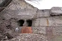 Upstream from the canal, much activity was underway during the 1940s to address the challenges at the Scofield Dam. As noted above, the dam had started to deteriorate significantly during the late 1920s. The outlet tunnel had failed numerous times, and an embankment was eroding away. On May 21, 1928, a beaver tunneling into the dam nearly caused the entire dam to fail.[6] In an emergency effort to decrease the pressure on the dam, the spillway was lowered several feet; it was lowered another 7.5 feet a few years later and then again in 1942.[6]