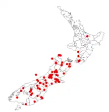 It is uncommon in the North Island, being found south of the Manawatu. In the South Island it is found more widely but has not been found in Westland and Fiordland. It is found from the coast to the mountains (to an altitude of 1000 m) growing on beaches and lake and stream margins.[4]