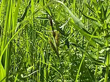 The rhizomous sedge has a prostrate stem, known as a stolon that runs along or slightly below the surface of the ground. It is able to produce new plants from buds found at the tip or nodes. The stems, or culms, of the sedge are typically 50 to 80 cm (20 to 31 in) in length with a triangular cross-section. The culms are smooth toward the bottom and become rougher toward the top. The base is often surrounded by red-brown coloured sheaths that deteriorate into a fibrous mass over time.[3] The leaves are almost as long as the culms and have flat, stiff and sheathed leaf-blades that are 3 to 5 mm (0.12 to 0.20 in) wide. There are clusters of leafy bracts beneath in inflorescences. The inflorescences consist of four to six spikes that have a narrowly lanceolate shape and are 1 to 3.5 cm (0.39 to 1.38 in) in length.[3]