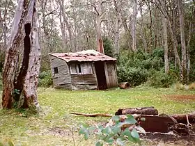 campsite and the historic 1934 hut, with Snow Gums at Careys Peak