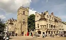 Carfax is the junction of St Aldate's (south), Cornmarket Street (north), Queen Street (west) and the High Street (east) in Oxford, England.[1] It is considered to be the centre of the city. The name "Carfax" derives from the Latin quadrifurcus via the French carrefour, both of which mean "crossroads". The Carfax Tower, also known as St. Martin's Tower (it is the remaining part of what was the City Church of St. Martin of Tours) is a prominent landmark and provides a look-out over the town.