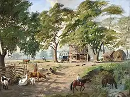 The family initially settled at Castell and Mill streets in New Braunfels. Leopold von Iwonski sold his 320-acre land grant and moved the family across the Guadalupe River from New Braunfels, to a settlement which came to be known as Neighborsville.[2] The Iwonski home was on the Old San Antonio Road and doubled as a stage stop. Young Carl helped out on the family farm, and became a naturalized American citizen in 1854. His first known artistic effort was an 1853 sketch of the family's log cabin.[3]