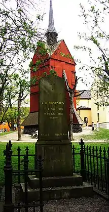The Swedish Evangelical Mission, intended to bring together the different revival groups, was formed by Hans Jacob Lundborg in 1856. Rosenius supported its founding.[17][24] A year later the organization bought the English Church's old building and reopened it as Bethlehem Church. Rosenius was able to work there as well as on numerous preaching trips throughout the country. He continued to edit and publish Pietisten, which went from 2,000 subscribers to 10,000 between 1850 and 1860.[3] Readers – both laypeople and clergy – sought his advice; he received multiple letters a day.[25] He published the journal until his death along with publishing and editing Missionstidningen and several other magazines.[24] During his last years he wrote an extensive series of articles on the Epistle to the Romans that appeared in Pietisten. On Pentecost Sunday, 1867, Rosenius suffered a stroke in the pulpit of St. John's Church in Gothenburg. He died the following year. He is buried in St. John's Cemetery in Stockholm.[26]