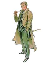 Cross is physically a tall, average, understated stylish Briton. His age is not revealed in the comics and animated series but it is estimated at early to mid 40s as the stories are set in the mid to late 1930s. His serious pale face is recognized by his eternal frown-eyebrows, blue eyes, sideburns, black hair with a free cloth wick on his right forehead. He is usually wear a hat, a brown trenchcoat, dark-blue suit, black waistcoat, white dress shirt, blue tie and black shoes with white gaiters. Alternative costumes are rarely seen in the series, except a running outfit. His tailor, Wallace Cripps, own a shop on Savile Row. His shoemaker, Italian Battistoli's, is based near Oxford Street. Cross drives a Bentley car and smokes a pipe, only the Navy Cut, from the Dunhill's house of Jermyn Street prepares for him; in the animated series, he does not smoke either cigar, cigarettes or pipes.