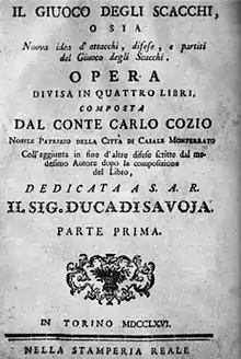 Carlo Cozio, Count of Montiglio and Salabue (c. 1715 โ€“ c. 1780) was an Italian chess player and theorist. He is best remembered for the book Il giuoco degli scacchi, and for the Cozio Defence.