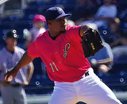 ![]() Contreras pitching for the Pensacola Blue Wahoos in 2013 | |