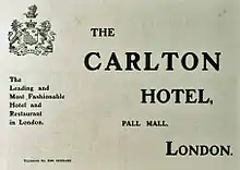 When building work began, César Ritz and Auguste Escoffier were employed by Richard D'Oyly Carte as manager and chef de cuisine respectively at the Savoy Hotel. They were already planning to set up independently, and had established the Ritz Hotel Development Company, when Carte dismissed them both in 1897 for financial irregularities.[2] After successfully opening the Hôtel Ritz in Paris the following year, Ritz agreed to take a 72-year Crown lease of the new hotel in London.[1] A limited company, The Carlton Hotel, Limited, was formed. The name Carlton comes from Carlton House, the nearby former home of the Prince Regent. The company's prospectus stated: