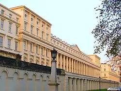 In the 20th century the terrace came under threat of partial or complete demolition and redevelopment, as were country houses at that time. By the 1930s there was little demand for large central London houses, and the Commissioners of Crown Lands were having difficulty in letting the properties. Two properties were let to clubs: no 1 to the Savage Club and no 16 to Crockford's gambling club, but residential tenants became hard to find.[7] Proposals for redevelopment were put forward by the architect Sir Reginald Blomfield, who had earlier been one of those responsible for replacing Nash's Regent Street buildings with larger structures in the Edwardian neo-classical style. Blomfield proposed rebuilding "in a manner suitable for hotels, large company offices, flats and similar purposes".[11] The suggested new buildings were to be two storeys higher than Nash's houses, and there was an outcry that persuaded the Commissioners not to proceed with the scheme.[12]