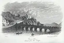 Geoffrey of Monmouth, writing in 1188, began the legend that Merlin was born in a cave outside Carmarthen.[21] The town's Welsh name, Caerfyrddin, is widely claimed to mean "Merlin's fort", but a reverse etymology is also suggested: the name Merlin may have originated from the town's name in the anglicised form of Myrddin.[22] (See Merlin § Name). An alternative explanation is that Myrddin is a corruption of the town's Roman name, Moridunum, meaning "sea fort."[23]