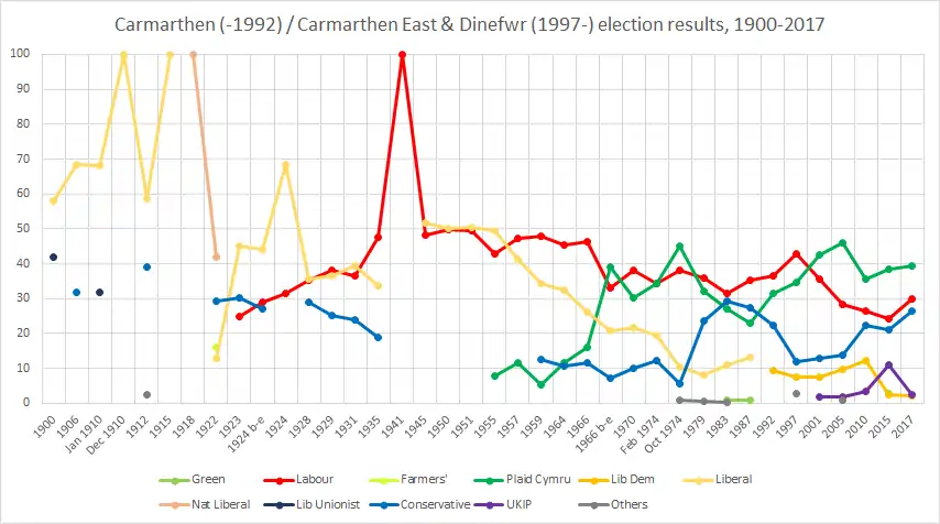 Because the seat contained mining areas in the valley of the River Gwendraeth (until the 1980s), much countryside and a high proportion of Welsh speakers, it was fertile territory for the Labour Party, the Conservatives and Plaid Cymru alike. Although the Conservatives never won the seat, they came within 1200 votes of doing so in 1983.