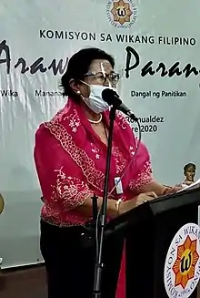 ![]() Carmelita Abdurahman in 2020 as newly designated commissioner for Waray language of Samar-Leyte delivering speech inside the hall of Komisyon sa Wikang Filipino | |
