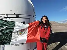 When she was twelve, she gained access to the Internet and immediately went to study NASA's website, looking for information about how to become an astronaut. She wanted to study astronomy or aerospace engineering, but those fields were not available in Culiacan.[2][5] She decided to study at a local international commerce school in the city. While there, she found out about a group of engineers going to visit NASA in Houston. The congress was the same week as the midterms, but despite being against the rules, she convinced all of her professors to let her take her exams early.[2] She then borrowed all her savings from her parents to finance the trip.[5] While in Houston, she visited various enterprises including the Johnson Space Center. She also attended the International Astronautical Congress, where she had an opportunity to talk to real astronauts.[5] Her question was how to work towards a career in space, as she was from Mexico and did not have programs to support those interested in such pursuits.[1][6] Astronaut Mike Massimino told her to study the sciences and engineering, fields NASA prefers, but of a type she had a passion for.[1][2]