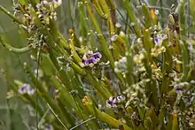 Carmichaelia hollowayi is a low-growing shrub (50–60 cm high), first growing as an erect shrub but later its stems trail and spread across the ground.[3]