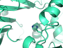The significant catalytic residue within all carnitine acyltransferases, including CROT, has been found to be a histidine residue, confirmed by site-directed mutagenesis studies. In CROT, this residue is at position 327. This residue, including the rest of the active site, is found at the interface between the N and C domains. The active site stabilizes carnitine by an intricate network of hydrogen-bonding residues, along with a key water molecule. The longer acyl chain is stabilized by hydrophobic residues arrayed in an approximately-cylindrical fashion.[3]
