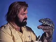 Carnosaur's special effects were largely designed by John Carl Buechler. Because Corman felt that stop-motion techniques and optical effects would interfere with filming, Buechler agreed with him that all the creatures would be "real-time" models.[10] In constructing the dinosaurs, he hired Mike Jones to sculpt the Deinonychus and Jeff Farley to sculpt the Tyrannosaurus rex.[10] The first creature constructed for the film, Farley's three-foot T. rex animatronic puppet, served as the basis for an unused suit model and the full-scale prop.[10] A system of hinges and cables was used to operate the creature and radio-operated eyes.[10]