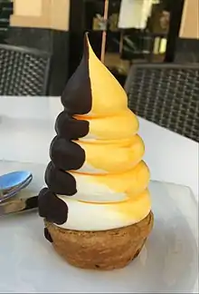 The Carolina is a typical pastry of Bilbao, Spain. It consists of a miniature pastry crust filled with custard and topped with a meringue cone. Typically, the cone has a coating of sweet egg yolk glaze and dark chocolate.