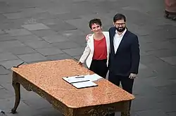 Carolina Tohá taking oath as Minister of the Interior and Public Security, alongside President Gabriel Boric on 6 September 2022.