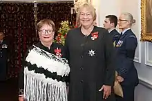 Henwood (left), after her investiture as a Dame Companion of the New Zealand Order of Merit by the administrator of the government, Dame Susan Glazebrook, at Government House, Wellington, on 13 September 2022