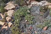 Carpobrotus ("Sour-fig") species are generally coastal plants, and of the seven species which occur in South Africa, this is the only species which naturally occurs inland in mountain fynbos.