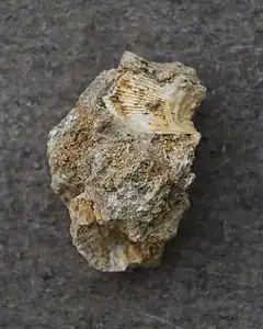 At the base of the deposit, these sandstones are reddish brown, very micaceous and shaley, sometimes containing calcareous nodules, ferruginous concretions and vegetable wax; above, they are gray and quartziferous. This is the Aye formation,[23] including spiriferida like Cyrtospirifer verneuili,[9] Rhynchonellida as Rhynchonella pugnus and R. boloniensis, some Orthoceras, Orthis striatula or Atrypa reticularis[10][24] Well-preserved feldspar and mica probably come from wind erosion under a semi-arid climate of mountains present in the Netherlands today and extending to Düsseldorf.[19]