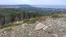 The geological composition of the summit is predominantly quartzite.[4] The high ground is a mixture of heathland and commercial forestry while the lower slopes are mainly farmland.[4] The forest on the mountain is mixed woodland including Lodgepole pine, Noble fir, Japanese larch, Lawson cypress, Scots pine, birch and beech trees and is a habitat for badgers, rabbits and a variety of birds.[3] The area around the summit includes a number of sites of historical interest including the former lead works at Ballycorus and the ruined church and round tower at Rathmichael.