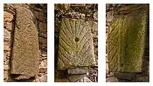All that remains of the church is the east gable of a thirteenth-century chancel and the south wall of a twelfth-century nave.[18] The church has lain in ruins since the end of the seventeenth century.[13] It is noted for its collection of grave slabs or leacs known as the Rathdown stones, nine examples of which can be found at the old church in Rathmichael attached to the south wall.[20] Thirty-two examples of these slabs are known around the Rathdown area and are found nowhere else in Ireland.[21] No two stones are the same but share similar types of decoration in the form of concentric circles, cup marks and herring-bone patterns.[13] It was once thought that these slabs dated to pre-Christian times but subsequent research has shown them to have been influenced by Norsemen art styles and they are now believed to be gravemarkers of Norsemen Christians.[22]