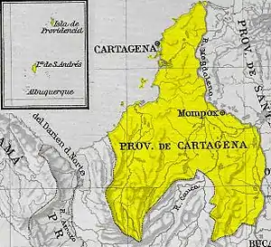 The boundaries of the province were not stable over the period of Spanish rule in the region. Limited knowledge of the territory's geography and its incomplete exploration did not permit the certain demarcation of borders between the governorates,[21] except in the case of identifiable natural topographical features, such as the Magdalena River, which defined the border with the province of Santa Marta. The colonial province of Cartagena included the territories of the present-day Colombian departments of Bolivar, Atlántico, Sucre and Córdoba, and after 1808, the island departments of San Andrés and Providencia, as well as the Mosquito Coast and the Mangrove Islands of present-day Nicaragua. With the proclamation of independence in 1811, Cartagena was surrounded by the following provinces (in clockwise order on the map): Santa Marta , Socorro and Antioquia. The boundaries between the provinces were not entirely clear, since they were never explicitly defined.[22][23]
