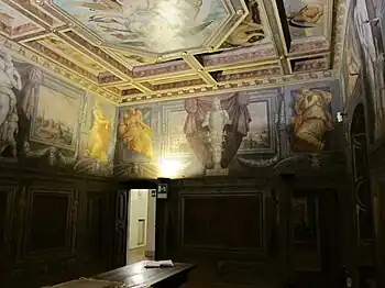 One of the best-preserved examples of an artist's house and the Mannerist style in Tuscany, it passed down through Vasari's heirs until they went extinct in 1687, after which it passed to the Fraternita dei Laici, to the Brozzi family and then in 1871 to the Paglicci family, with the latter selling it to the state in 1911 to become a public museum. Initially displayed with Mannerist furniture and some works from the city and Fraternita collections,[2] in the 1950s these were removed and replaced with a picture gallery of around sixty paintings by Vasari's collaborators and contemporaries from gallery collections in Florence, particularly works by "the studiolo painters", with the intention of setting up a museum on the Mannerist period.[3] To mark the 500th anniversary of Vasari's birth, in 2011 the gallery was redisplayed and the visitor facilities upgraded.[4]