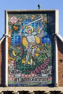 This property belonged to Josefa Terradas, that of who we find references in decorative artificial stone pinnacles, where a florid rod is represented, with a Gothic letter engraved in stone. Josefa's property went from Avinguda Diagonal to Carrer Rosselló, in whose rear façade we find another ceramic panel drawn by the same Monserdà, where it represents Sant Jordi slaying the dragon and reads: «Patron Saint of Catalonia give us back our freedom».