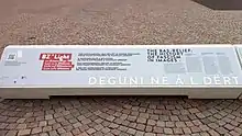 Despite being state-owned and continuous protests by German-speaking South Tyroleans, the relief remained untouched for decades. In 2011, the Italian Minister of Culture Sandro Bondi finally agreed to a contextualisation or removal of several fascist era remains in the province during negotiations with members of parliament of the South Tyrolean People's Party about an upcoming vote of no-confidence.[1] In 2017, like the Bolzano Victory Monument,[2] the Piffrader frieze was also subjected, on the initiative of the South Tyrolean Provincial Administration and on the basis of a joint historical commission proposal,[3] to an intervention of historicization and recontextualization, on an artistic project by Arnold Holzknecht and Michele Bernardi, with the affixing of an illuminated inscription bearing a quotation from the philosopher Hannah Arendt in three languages (Italian, German, Ladin) — "No one has the right to obey" — as opposed to the fascist dogma of Believe, obey, combat (Credere, obbedire, combattere) still present on the bas-relief.